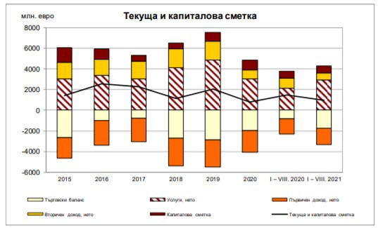 В БНБ изчисляват, че само за август салдото по текущата сметка е с положителна стойност и възлиза на 328,3 млн. евро, като за същия месец на миналата година беше на плюс с 66,8 млн. евро. От януари до август текущата сметка е положителна и възлиза на 280,5 млн. евро при положително салдо от 800,9 млн. евро за същия период на 2020 г.