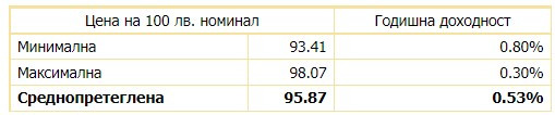 Въпреки това обаче постъпилите поръчки са за едва 517,9 млн. лв., което съответства на коефициент на покритие 1,04% и сигнализира за понижаващ се интерес. В същото време и търсената доходност от пазара се покачва - постигнато е средно ниво от 0,53%, а за сравнение преди месец същата емисия за 300 млн. лв. беше при доходност от 0,2%. Това може да принуди държавата скоро да излезе и на международните пазари, където обичайно има премия в доходността спрямо емисиите на местния пазар.