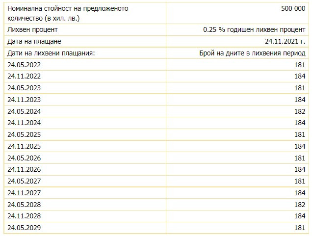 Годишният лихвен процент е 0,25%, а датата на плащане е 24 ноември 2021 г., съобщи БНБ.