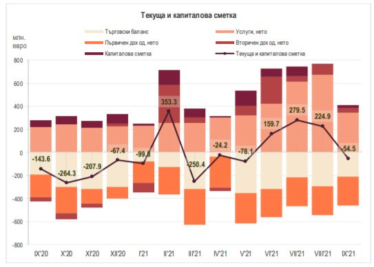 В централната банка изчислиха, че текущата и капиталова сметка е на отрицателна територия с 54,5 млн. евро при дефицит от 143,6 млн. евро за септември 2020 г. От първите девет месеца на тази година тя е положителна и възлиза на 510,3 млн. евро, като преди година за същия период пак беше с излишък от 1,325 млрд. евро.