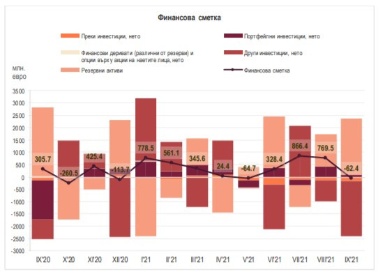 Финансовата сметка е на минус с 62,4 млн. евро при положителна стойност от 305,7 млн. евро за септември 2020 г. За януари – септември тя е положителна – 3,546 млрд. евро, като за същия период на 2020 г. пак имаше положителна стойност от 2,569 млрд. евро.