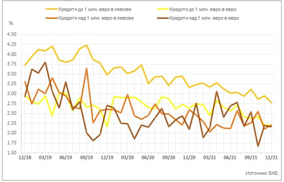 БНБ отчита, че през декември средният лихвен процент по кредитите до 1 млн. евро, договорени в левове, намалява с 0,18 пр. п. до 2,77%, а по тези над 1 млн. евро се повишава с 0,10 пр. п. до 2,21%.