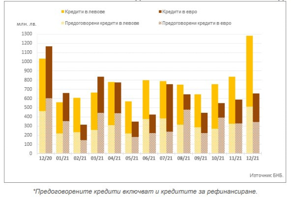 При обема на предоговорените заеми и тези за рефинансиране в левове се наблюдава увеличение с 56,3% (183,4 млн. лв.) до 509,3 млн. лв. на месечна база.