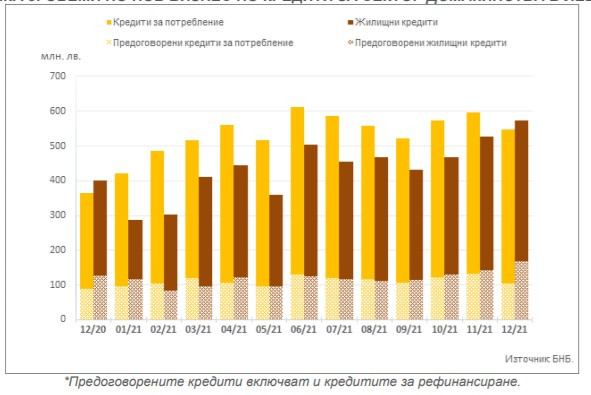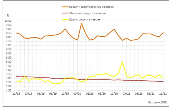 През декември 2021 г. средният лихвен процент по заемите на домакинствата за потребление в левове на месечна база се повишава с 0,50 пр. п. до 8,55%, а годишният процент на разходите (ГПР) по тези кредити – с 0,46 пр. п. до 9,04%.