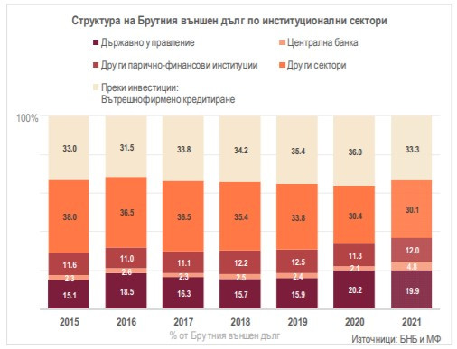 В БНБ отчитат, че в края на декември вътрешнофирменото кредитиране е в размер на 13,810 млрд. евро 2021 г., което е с 3,2% по-малко в сравнение с края на декември 2020 г. То е с най-значителен дял в структурата на външния дълг – 33,3% към края на декември 2021 г., при 36% година по-рано.