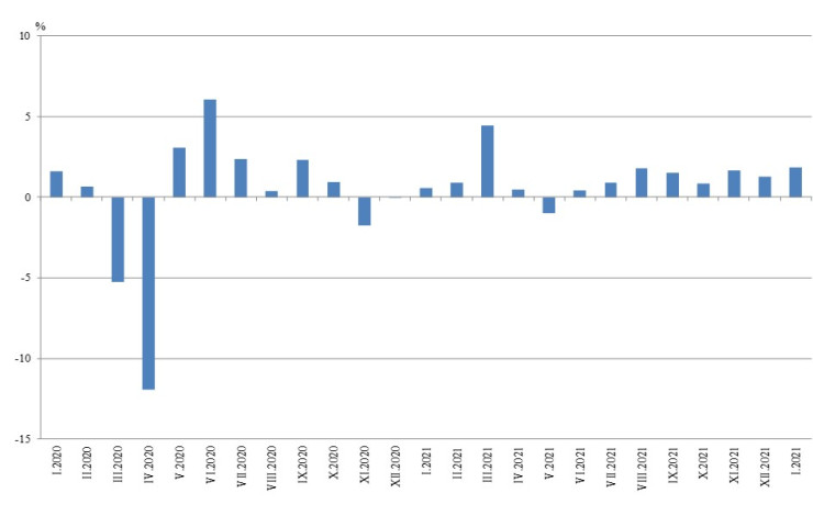 През януари повишение спрямо декември има в добивната промишленост - с 10,3%, и при преработващата промишленост - с 2,5%, а намаление - в производството и разпределението на електрическа и топлоенергия и газ - с 3,9%.
