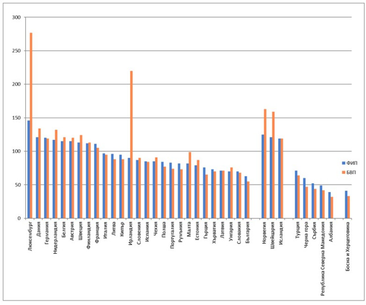Информацията за ФИП е на базата на експресни оценки на паритетите на покупателната способност (ППС) за 2021 г., публикувани на страницата на Евростат. Това прессъобщение представя част от данните от по-детайлната публикация в Statistics Explained.