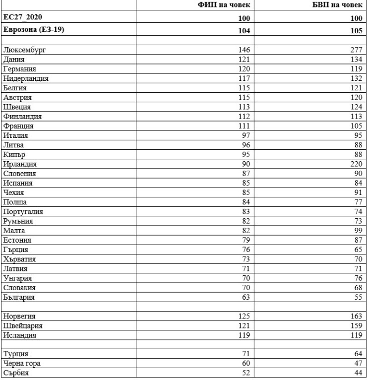 Пет държави членки бележат ФИП на човек от населението с 25% и повече под средното за ЕС-27 равнище. В Хърватия, Латвия, Унгария и Словакия е от 27 до 30% по-ниско от средното за ЕС-27. В България ФИП е с 37% по-ниско от неговото средно ниво за държавите от ЕС-27.