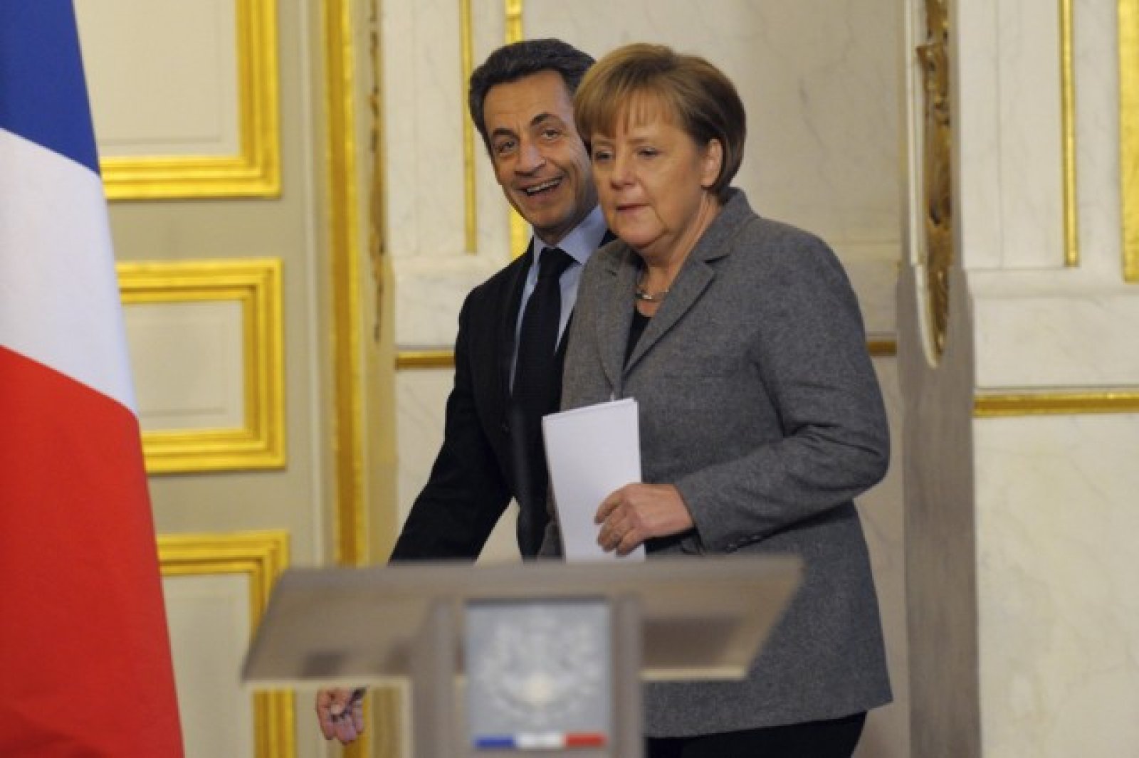 Френско-германските неравностойни взаимоотношения бяха увековечени и от френските карикатуристи. В Le Monde например изобразиха Ангела Меркел като матрона в униформа, която бута Никола Саркози в инвалидна количка. В Liberation пък германският канцлер беше изобразена като майка, която дърпа за ръка детето си Саркози и го пита „Ein Problem?“, а френският президент отговаря с "Non, non“.