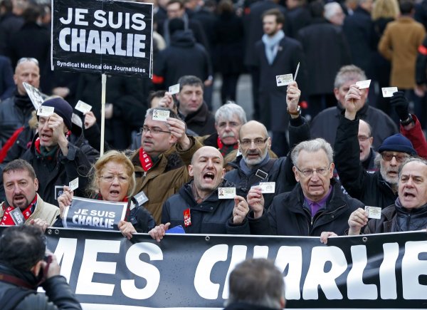 Стотици хора носеха лозунги "Аз съм Шарли" или вдигаха моливи и химикалки като знак за свободата на словото.