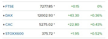 Лондонският бенчмарк FTSE 100 приключи сесията със спад от 0,15% до 7277,85 пункта, докато във Франция измерителят CAC 40 завърши деня с ръст от 0,43 на сто до 5275,02 пункта. Германският индекс DAX отбеляза повишение с 0,36% до 12002,93 пункта.