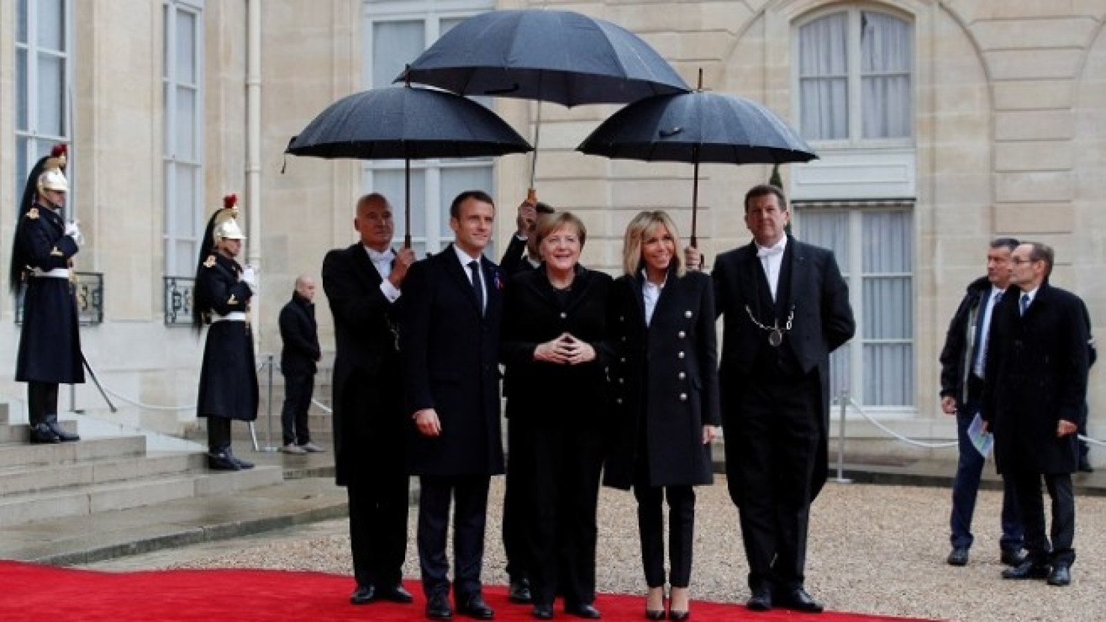 При настаняването на гостите на церемонията при Триумфалната арка президентът Макрон ще е между съпругата си и канцлерката Ангела Меркел.