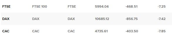 Основните европейски борсови индекси приключиха днешната напрегната сесия с понижения от над 7%, след като преговорите между страните от ОПЕК+ относно съкращенията в добива на петрол пропаднаха, а епидемията от коронавирус продължава да се разпространява и да взима нови жертви, съобщава CNBC.