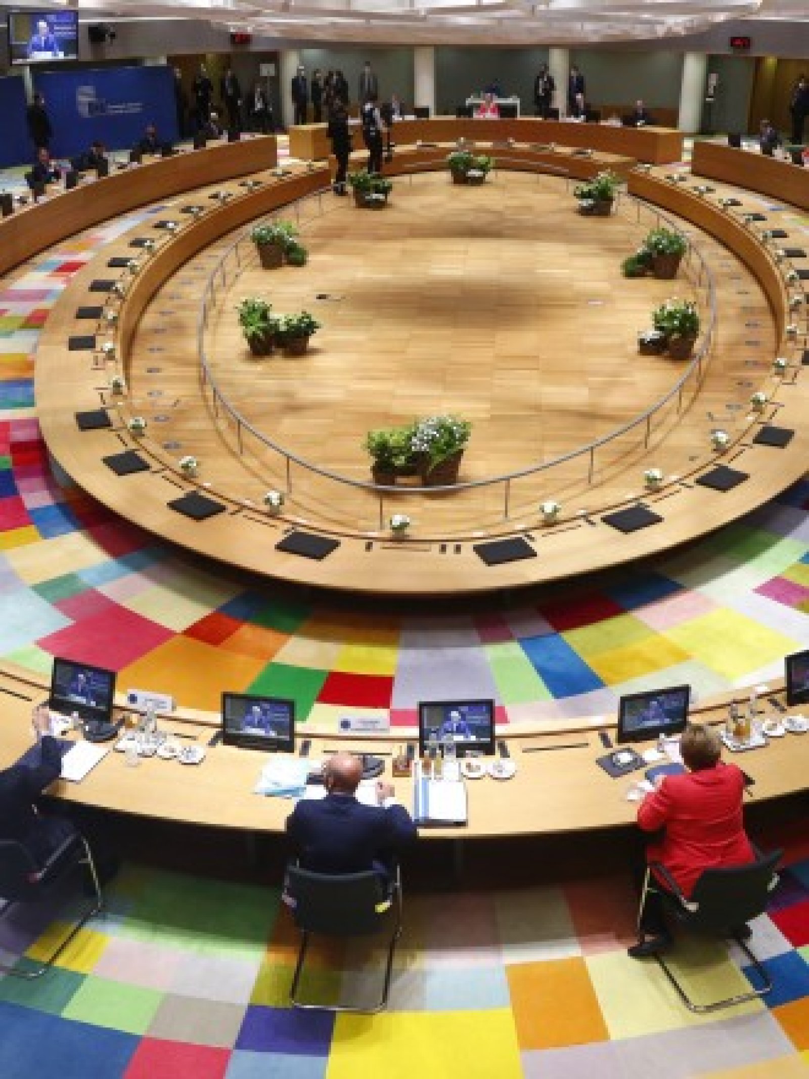 След първоначалния поздрав с лакът между 27-те, всички носещи маски, и подаръците за рождените дни на Меркел и португалския премиер Антониу Коща последваха напрегнати срещи вечерта с Рюте и унгарския премиер Виктор Орбан.