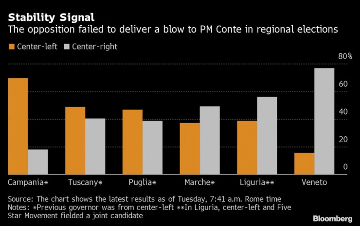 Партиите начело на алианса на Конте - антисистемното движение „Пет звезди“ и дясноцентристката Демократическа партия, успяха да запазят силното си присъствие в три региона, включително бастиона на левицата Тоскана, както и в Пулия на юг. Това показват предварителни изчисления на Consorzio Opinio Italia за телевизия Rai, цитирани от Bloomberg.