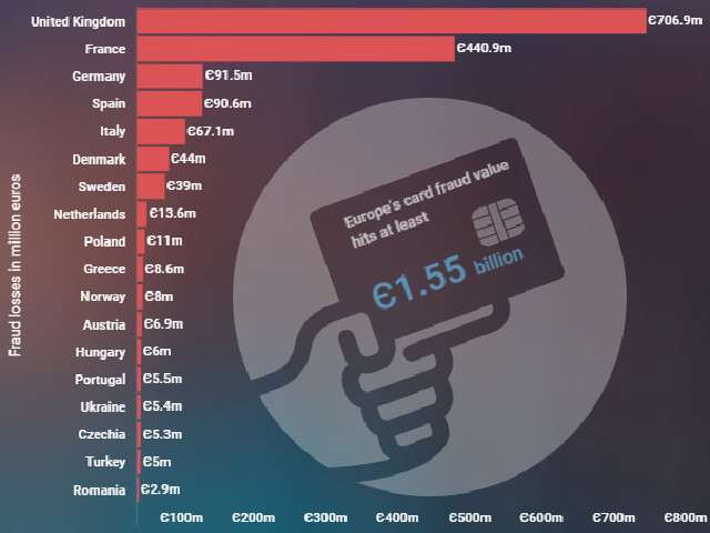 Сумата, която е била загубена на Острова, възлиза на 709,9 млн. евро. На второ място се нарежда Франция с 440,9 млн. евро. Третото място е за Германия с 91,5 млн. евро, следвана от Испания с 90,6 млн. евро. Италия е пета с 67,1 млн. евро загуби от измами с разплащателни карти. Сред изследваните държави, сред които обаче не е България, най-малко са щетите в Румъния – 2,9 млн. евро.
