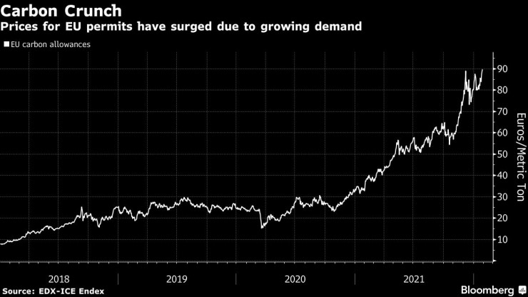 Цената на въглеродните квоти расте. Графика: Bloomberg