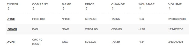 Паневропейският индекс Stoxx 600 приключи деня с 1,1% спад. Банките и автомобилните компании се озоваха с повече от 3% надолу и поведоха спадовете, докато акциите на петролните и газовите компании записаха над 4% повишение, след като цените на петрола се повишиха.