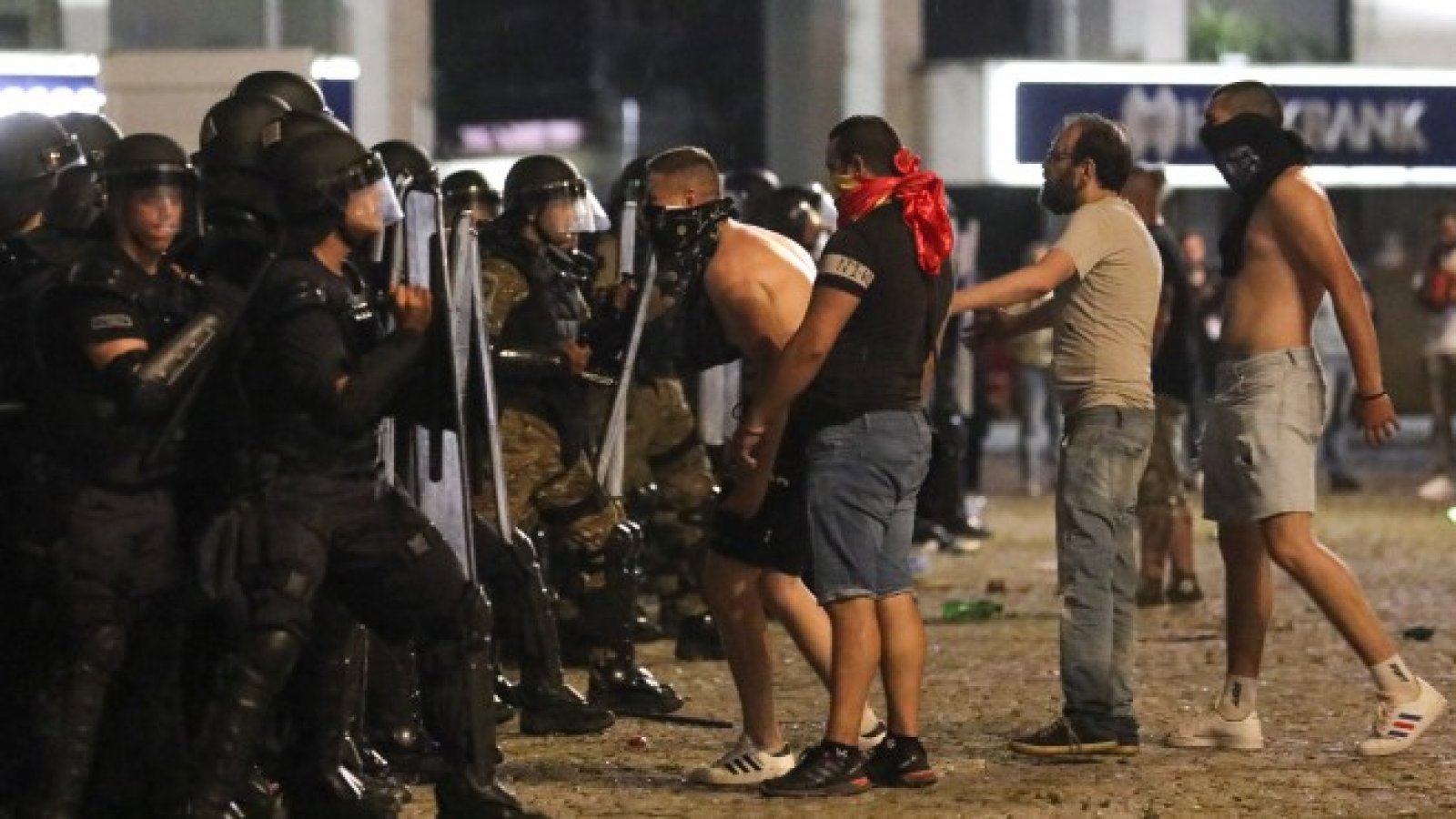 След известно време вербални атаки, към полицията полетяха камъни, изкъртени кошчета за боклук и пътни знаци, а кордонът успя да изтласка агресивната група протестиращи на улицата пред парламента, а след това и през улицата и да я раздели на две. Видя се ранен полицай, когото колегите му изнесоха на ръце извън кордона, по посока на пристигналата линейка. Можеха да се видят и няколко арестувани.
