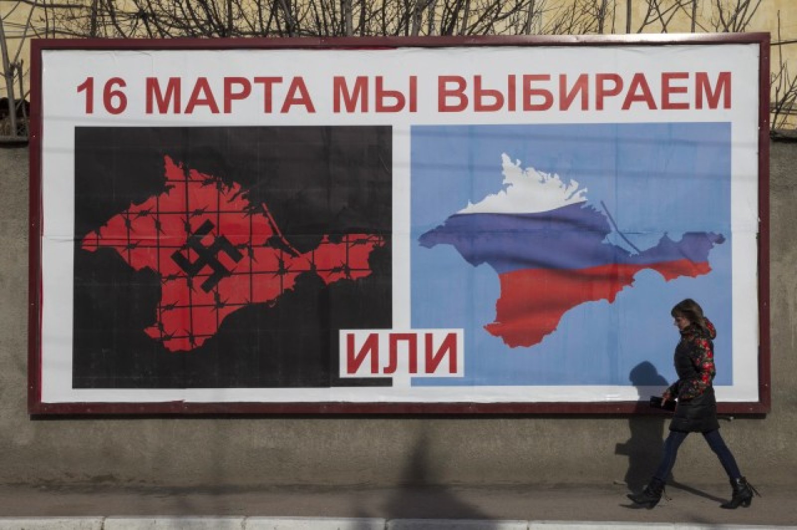 На един плакат то поставя населението пред избора на това дали то би предпочело да се присъедини към Русия или да падне под нацистко господство. В единия край на плаката се вижда Крим, обагрен в руските национални цветове, а другият вариант е снабден с контури на полуострова, които са в кървавочервено и са снабдени със свастика. "На 16-и март решаваме ние", пише отгоре.