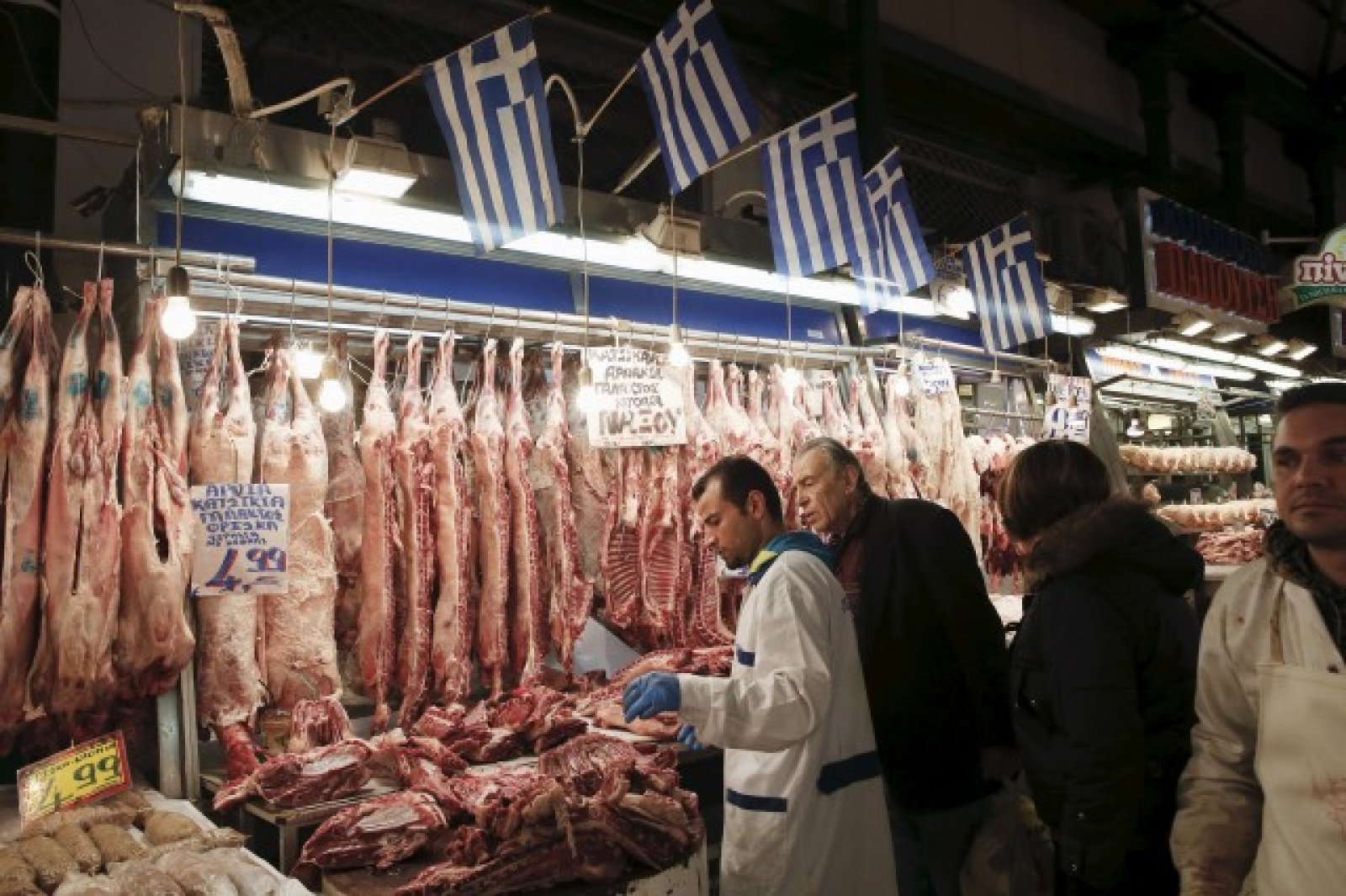 Режейки парчета агнешко место и окачвайки свински наденички, месарите на централния пазар в Атина са едни от първите, които усещат силата на капиталовия контрол. С малко еврови банкноти в брой купувачите намаляват месото в менюто си.