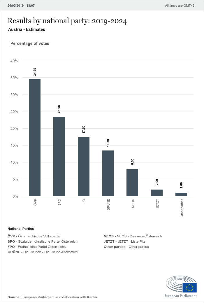 Австрийската социалдемократическа партия губи половин процент в сравнение с миналите избори и с 23,5 процента се нарежда на второ място. Аферата от Ибиса се отразява с 2,2 процента минус на Австрийската партия на свободата, която получава 17,5 процента от гласовете. Партията на зелените печели прогнозни 13,5 процента и губи един процент, НЕОС запазват своите осем процента от гласовете на далите своя вот австрийци.