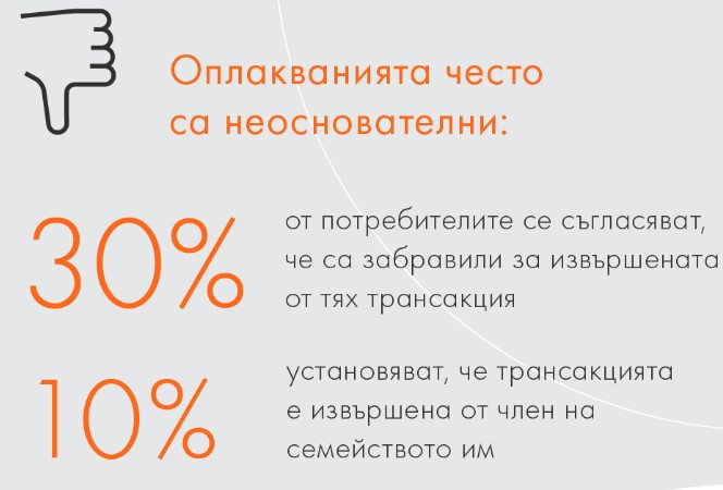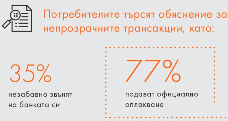 При установяване на неясна трансакция, почти шест от всеки десет потребители в Европа успяват след време да си припомнят покупката си, 6% не предприемат нищо, разяснение от търговеца търсят 6%, а от банката - 35%.