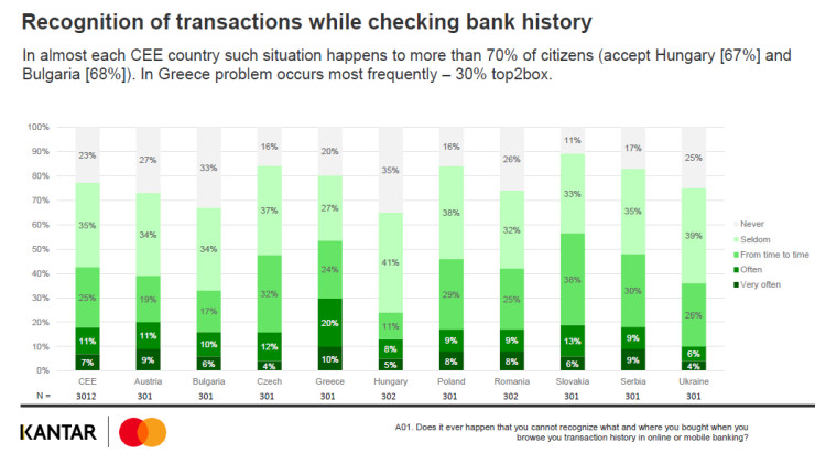 Проучването, направено през ноември 2020 г. от Kantar TNS в десет европейски държави, показва, че българите са на водещо място в Централна и Източна Европа по силно негативни преживявания при неразпознаване на трансакции в извлечението на картата си – 47% при средно ниво за ЦИЕ 30%. За един от всеки пети картодържател от Полша, Украйна, Чехия, Унгария, Румъния, Гърция, Словакия, Австрия, България и Сърбия, това се случва доста често.
