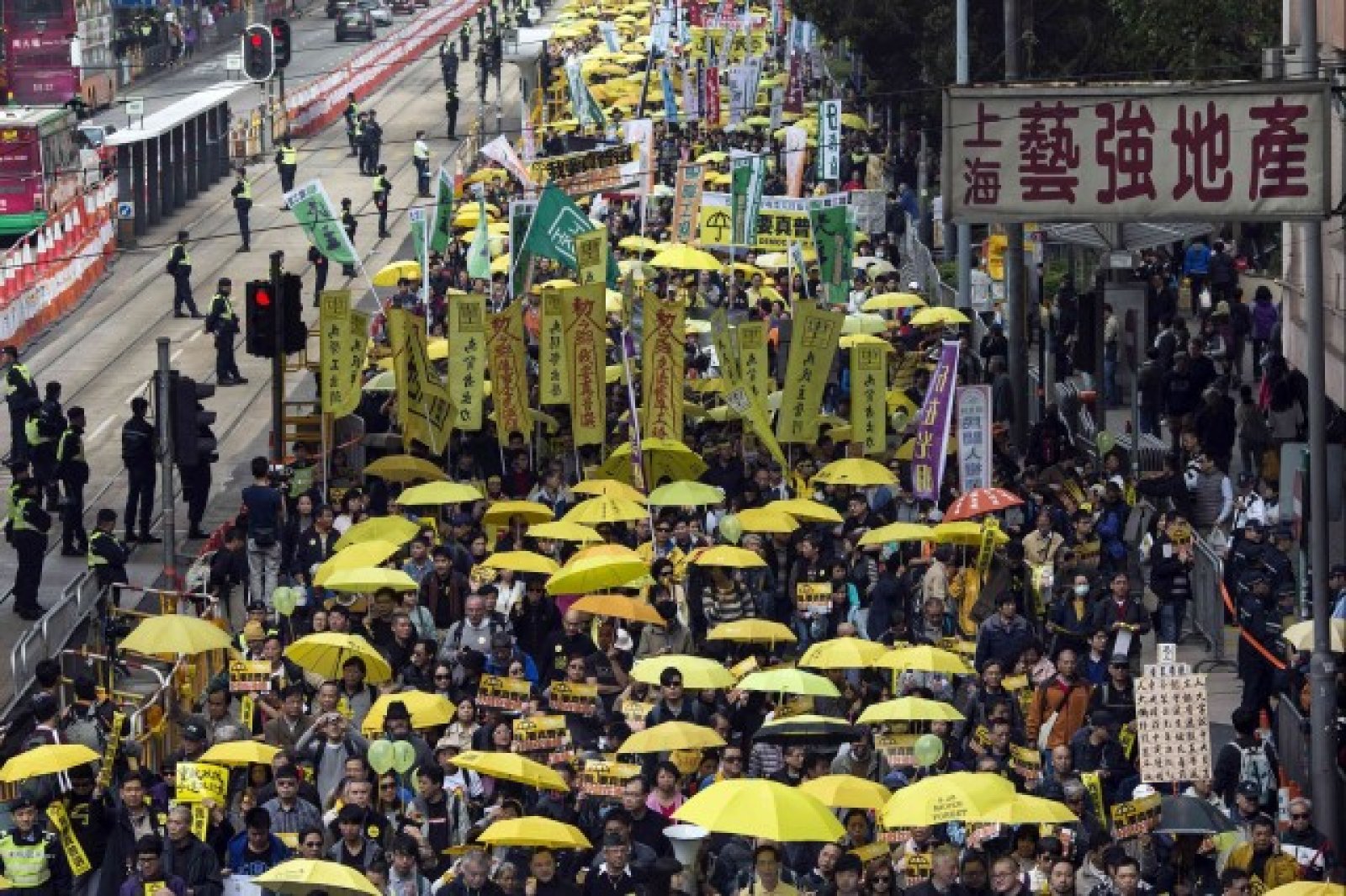 В ръка с жълти чадъри, станали символ на продемократичната кампания, участниците дефилираха бавно из градския център, "настоявайки за истински всеобщо избирателно право" на изборите за глава на местното правителство през 2017 г., посочва Франс прес.