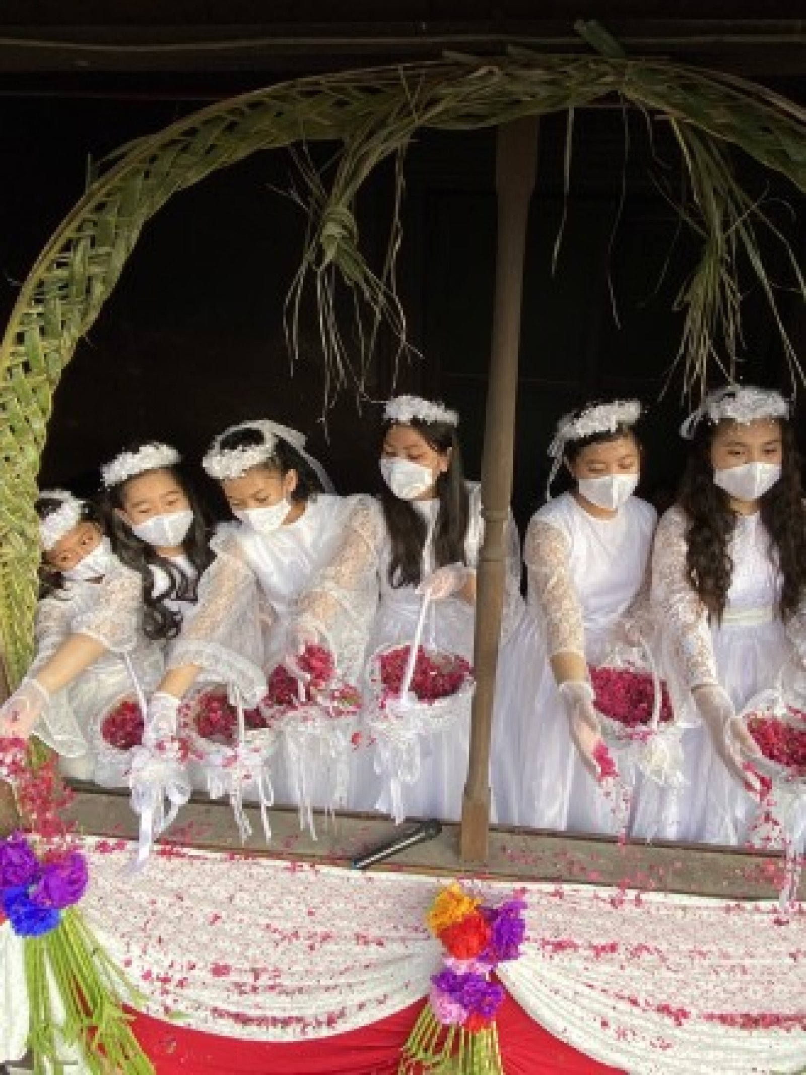 Филипински деца обсипват с розови листенца богомолци, държащи палмови клонки по време на служба за Палмова неделя или Цветница пред църква в Лас Пинас, Филипините. След две години на отсъствие заради коронавируса католици в цял свят се стекоха в църквите, за да празнуват Палмова неделя.