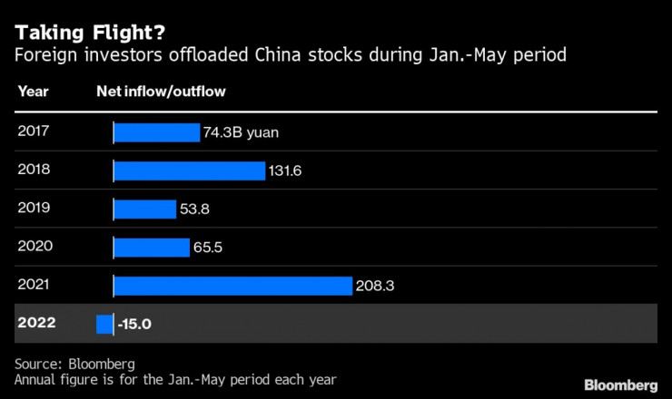 Чуждестранните инвеститори са изтеглили средства в размер на 15 млрд. юана (2,2 млрд. долара) от акции, търгувани в Шанхай и Шънджън, през първите пет месеца на годината. Това е първият нетен отлив на средства за периода, откакто Bloomberg събира данни от 2017 г. Основната част от разпродажбите е била през март – когато войната в Украйна разтърси пазарите, а Шанхай отново бе блокиран заради коронавируса. Оттогава обаче покупките са по-скоро скромни.