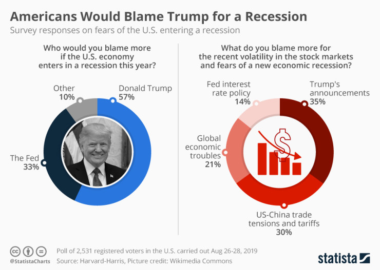 57 процента от американците биха обвинявали президента на страната Доналд Тръмп, ако САЩ изпаднат в рецесия през следващата година. Само 33 процента заявяват, че централната банка на страната (Фед), която влияе върху икономиката, като определя лихвения процент на страната, би носила вина, става ясно от скорошно приучване на общественото мнение на Harvard-Harris.