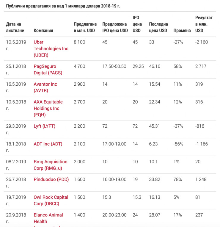 Таблицата на публичните предлагания за последните 2 години, които са надхвърлили един милиард долара, е дори още по-красноречива. Кумулативната доходност от тях е едва 3% и много добре се вижда как компаниите с отрицателна оперативна печалба реализират и отрицателен резултат за акционерите.