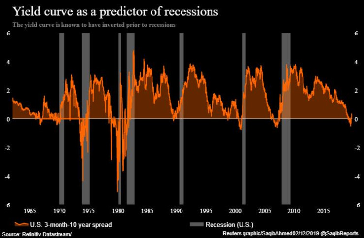 Когато спредът между доходността по 3-месечните и 10-годишните американски държавни ценни книжа се понижи под нулата, както стана по-рано тази година, това е знак, че инвеститорите приемат по-ниска доходност за заключване на парите за по-дълъг период от време.