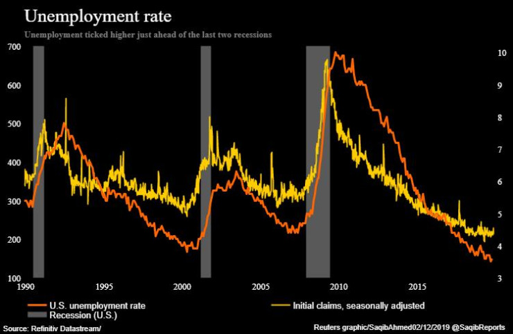 Нивото на безработица в САЩ и първоначалните молби за помощи при безработица отбелязват по-висока стойност преди или по време на първите дни от последните две рецесии, преди рязко да се повишат. Понастоящем нивото на безработица достига близо 50-годишно дъно. Инвеститорите ще следят внимателно броя на новите молби за безработица през следващите месеци.