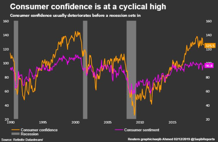 Потребителското търсене е критичен двигател за американската икономика, като в исторически план доверието на потребителите намалява по време на спад. Сегашното ниво на потребителско доверие е близо до цикличния максимум.