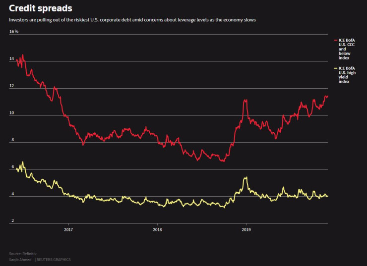 Кредитните спредове обикновено се разширяват, когато предполагаемият риск от неплатежоспособност се повиши. В момента инвеститорите се изтеглят от най-рисковия американски корпоративен дълг на фона на опасенията относно нивата на ливъридж, докато икономиката се забавя.
