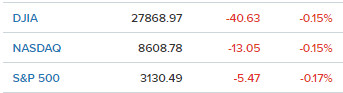 Бенчмаркът на сините чипове Dow Jones Industrial Average, който следи търговията с акции на 30-те най-големи публични американски компании, изтри 40,63 пункта от стойността си, или 0,15%, като достигна ниво от 27 868,97 пункта.
