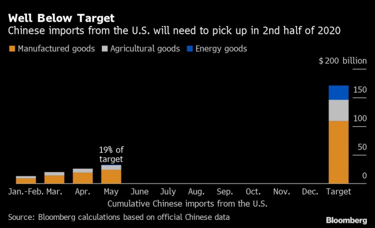 До края на май тази година Китай е направил едва 19% от целевия обем покупки за над 170 млрд. долара за 2020 г., показват изчисления на Bloomberg. Това означава, че страната ще трябва да купи стоки за още 139 млрд. долара през останалата част от годината, за да бъдат спазени договорените през януари условия.