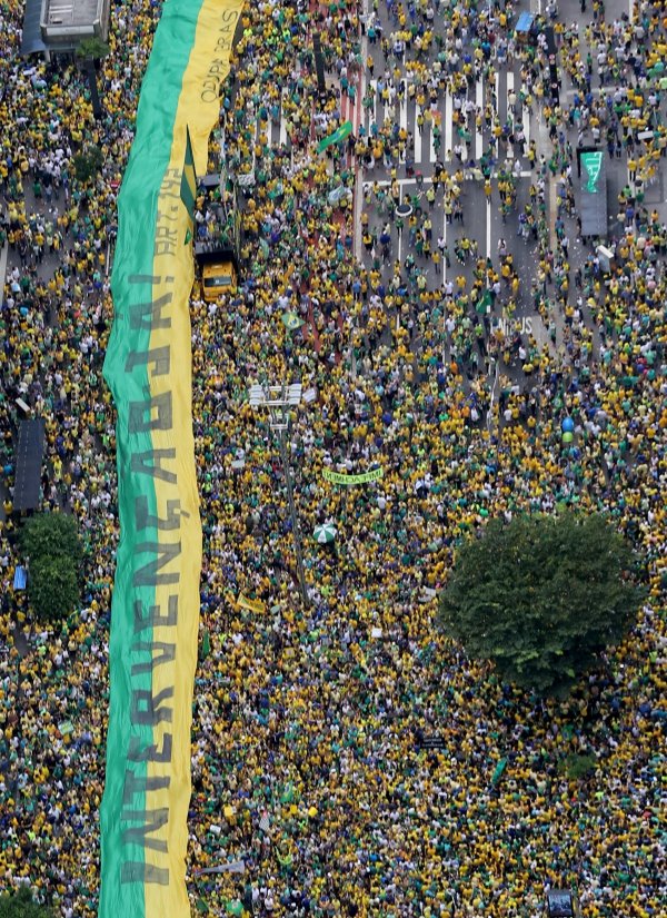 Демонстрациите бяха мирни, като десетки хиляди носеха националните жълти и зелени цветове и носеха лозунги, на които се четеше „Дилма вън“ и „Спрете корупцията“.