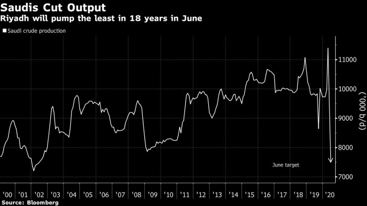 Рияд има за цел да изпомпва малко под 7,5 млн. барела на ден през юни, в сравнение с официална цел по най-новото споразумение на ОПЕК+ за добив от малко под 8,5 млн. барела на ден.
