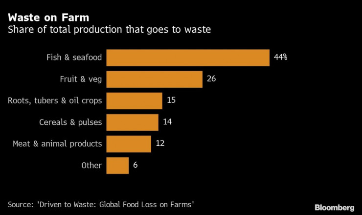 Около 2,5 млрд. тона храна се губи във фермите или се изхвърля от търговците на дребно или потребителите. Това е около 40% от цялата продукция, показват данни от проучване на Световния фонд за природата (WWF) и британския търговец на дребно Tesco, цитирано от Bloomberg.