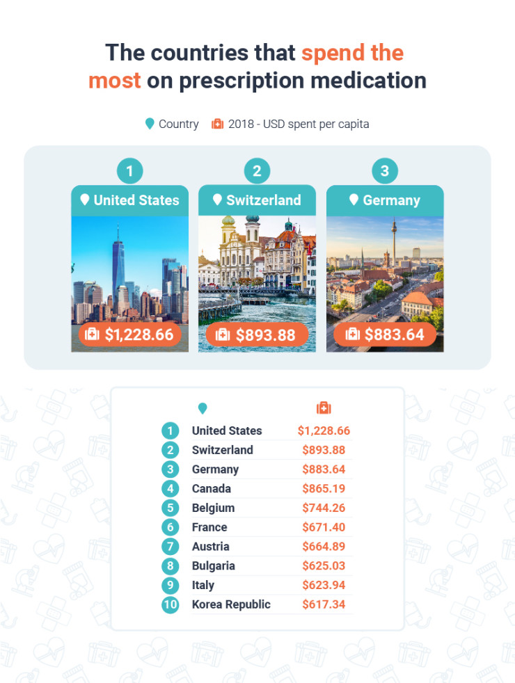 Сред 10-те държави с най-високи разходи за лекарства на глава от населението влизат също Канада, Белгия, Франция, Австрия, Италия и Южна Корея.