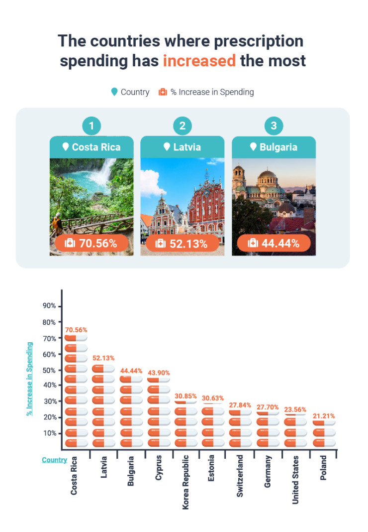 Същевременно в Коста Рика е отчетено най-голямото увеличение на разходите за лекарства между 2013 и 2018 г. - със 70,56%, но до само 275,04 долара на глава от населението през 2018 г. На второ място по ръст на разходите е Латвия с 52,13% до 491,72 долара. Топ 10 по поскъпване на лекарствата в този период се допълва от Кипър, Южна Корея, Естония, Швейцария, Германия, САЩ и Полша.