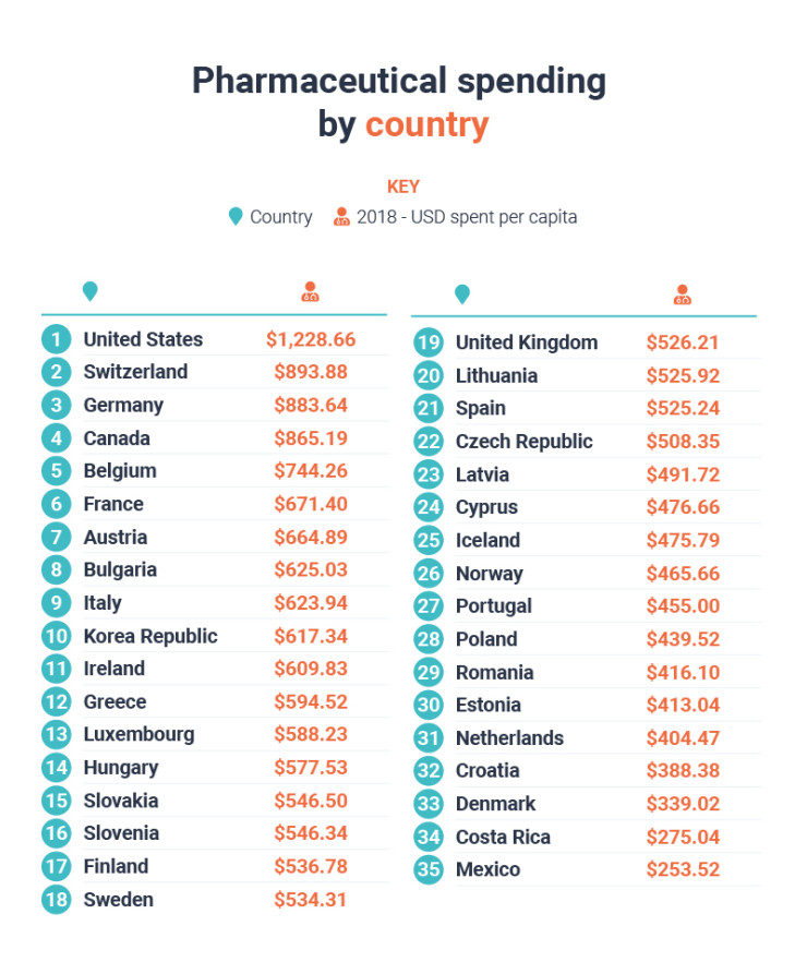 Компанията е направила сравнение на разходите за лекарства в 35 държави, като е използвала данни на Организацията за икономическо сътрудничество и развитие (ОИСР) за сумата, изразходвана за фармацевтични продукти от 2013 г. до 2018 г.*