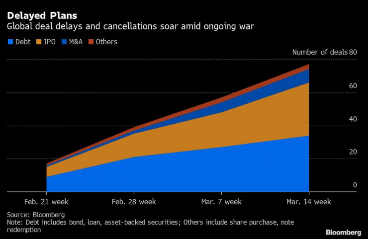 Компании в цял свят все по-бързо се отказват от плановете си за набиране на средства на фона на волатилността, дестабилизираща кредитните пазари след инвазията на Русия в Украйна, съобщава Bloomberg.