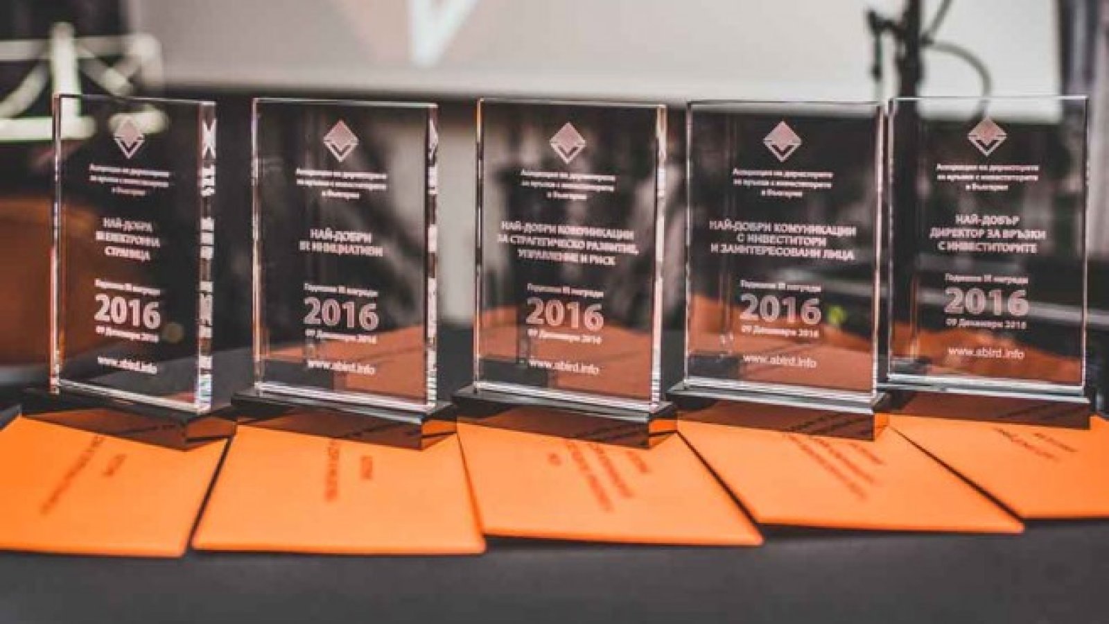 За „Най-добри IR инициативи“ наградата взе Станислав Танушев от Сирма Груп Холдинг. За „Най-добри комуникации за стратегическо развитие, управление и риск“ отличието прибра Атанас димитров от Терафонд АДСИЦ, а в категорията „Най-добри комуникации с инвеститори и заинтересовани лица“ отличена бе Даниела Пеева от Монбат и председател на Асоциацията на директорите за връзка с инвеститорите.