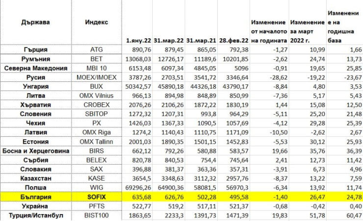 През март 2022 г. в сравнение с март 2021 г. най-силен ръст отбелязва турският индекс BIST100 - 60,47%. На второ място по годишен ръст е BIRS в Босна и Херцеговина с 36,39%, а на трето е OMX Tallinn в Естония с 25,95%.