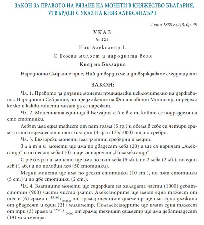 Със закона се създава националната парична единица „лев“, разделен на сто части – „стотинки“, и се определят теглото, металното съдържание и изображенията на българските монети.