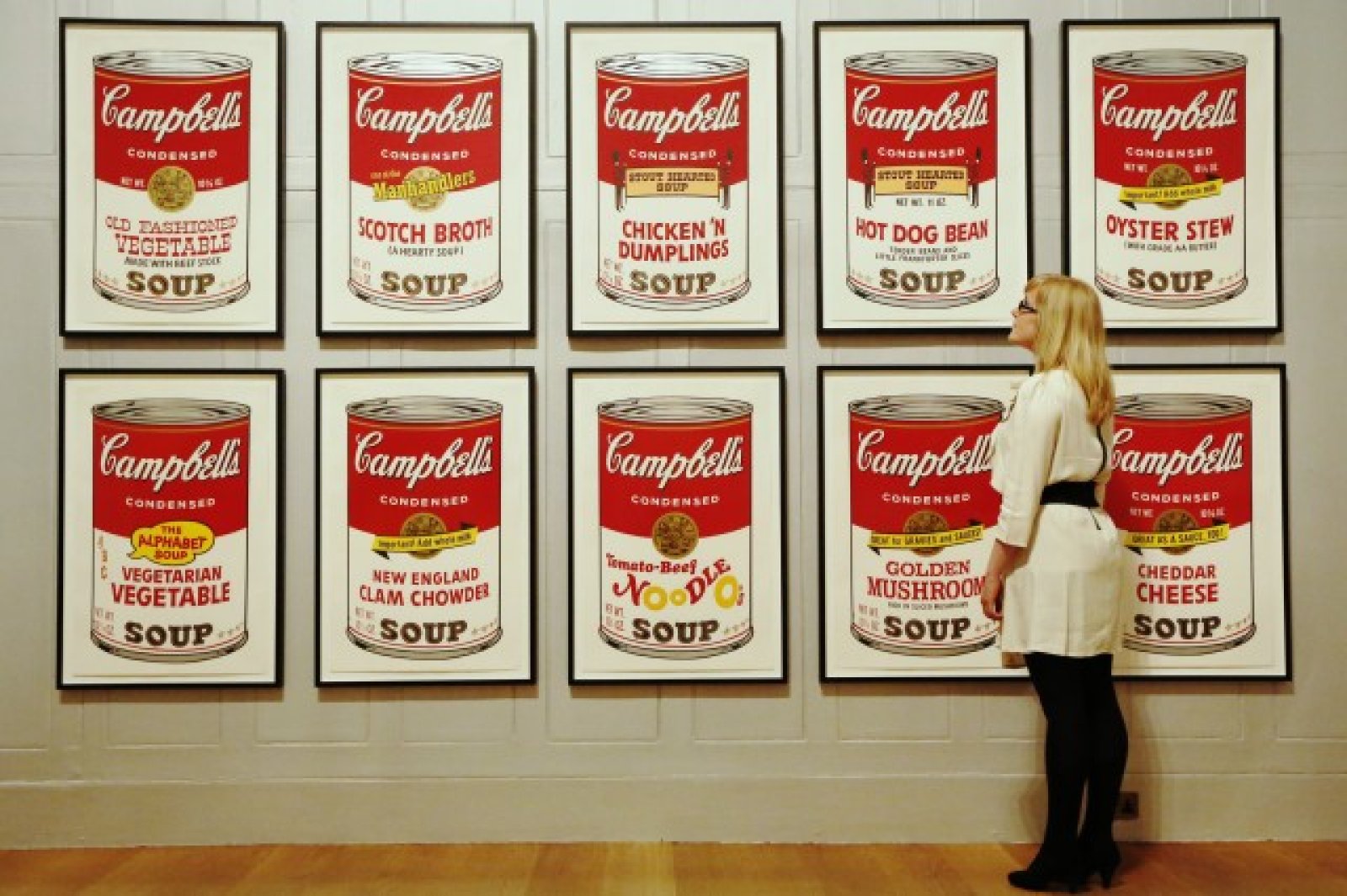 На платната са изобразени консервени кутии със супа на компанията Campbell.